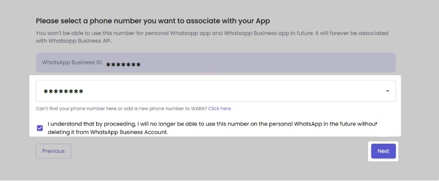After the page auto-refreshes, select the number connected to WABA from the list, check the warning about this number being unavailable in your personal account, and click "Next".