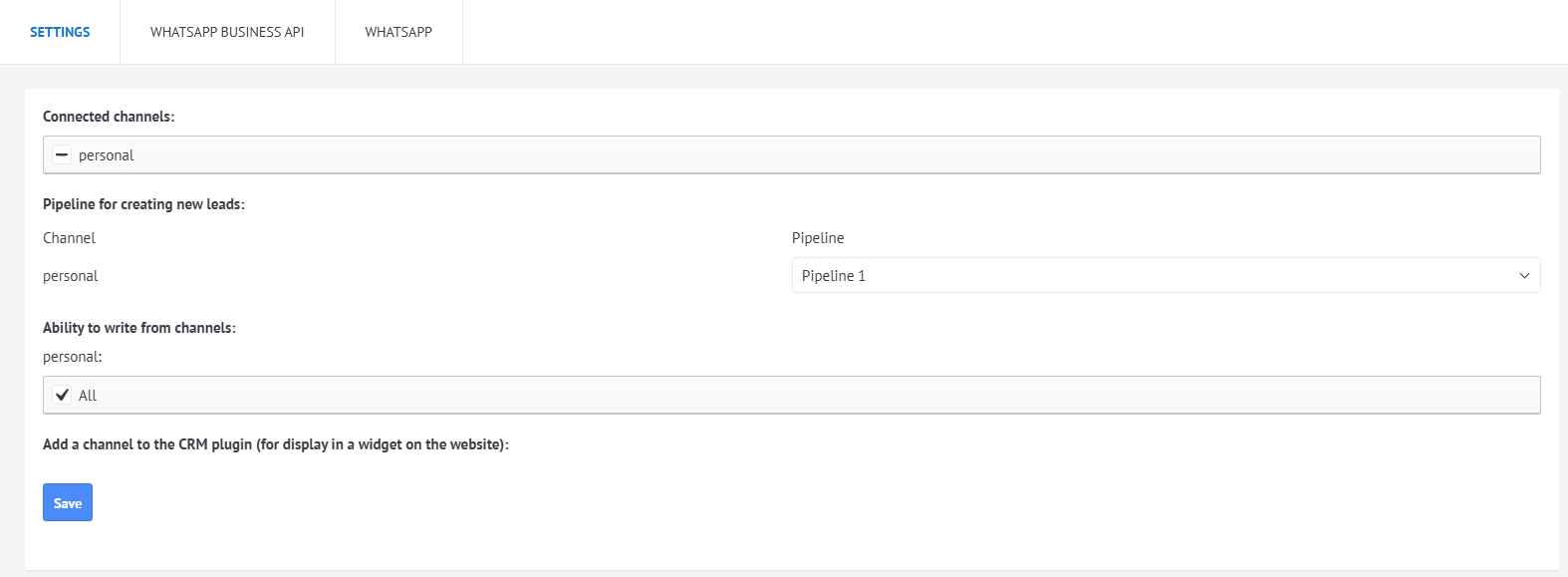 Após a conexão, acesse "Configurações", selecione o canal e escolha o pipeline onde serão criados novos leads.