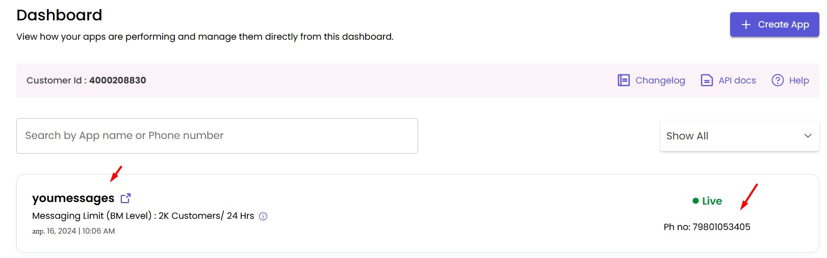 Переходим в настройки приложения и копируем ID приложения Gupshup и API-ключ аккаунта Gupshup (если api-ключа нет, необходимо его создать, нажав на "Создать API ключ")