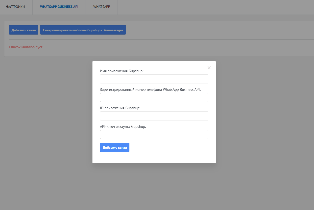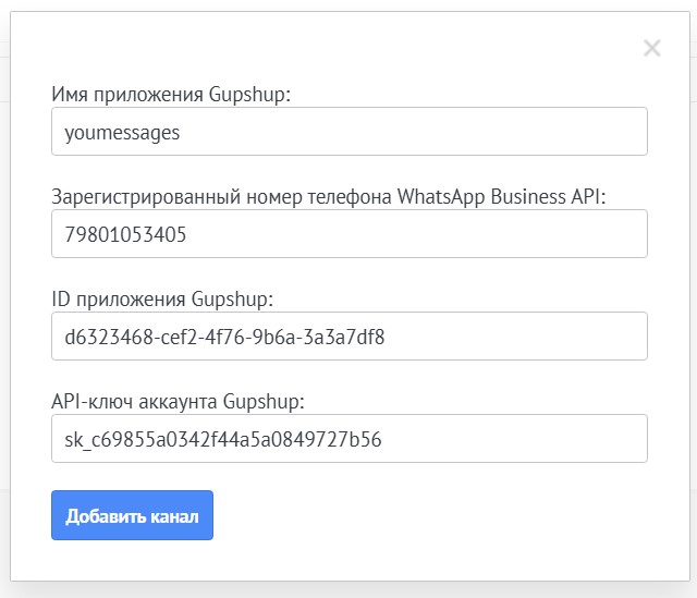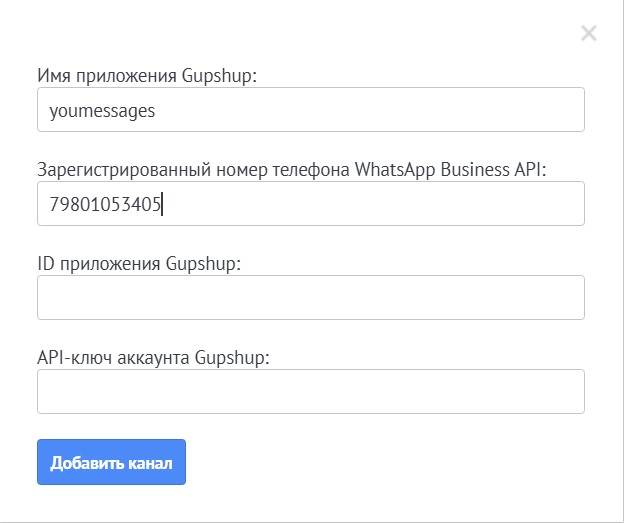 Нажимаем на "Добавить канал", откроется окно, где нужно заполнить обязательные поля. Данные нужно взять с вашего личного аккаунта Gupshup https://www.gupshup.ai/ (инструкция далее по тексту)
