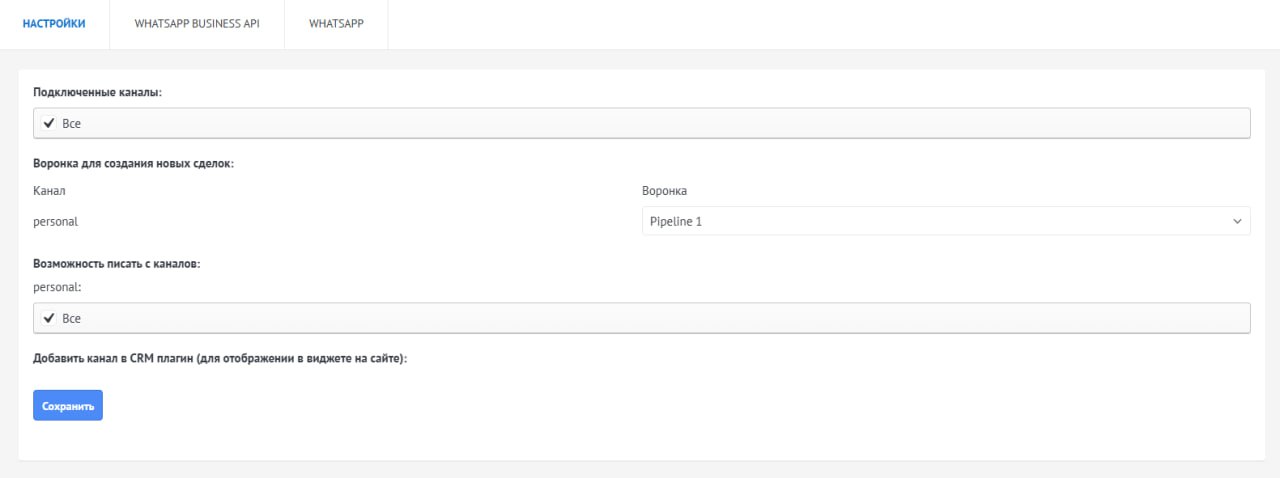 После подключения переходим в "Настройки", выбираем канал и выбираем воронку, где будут создаваться новые лиды.
